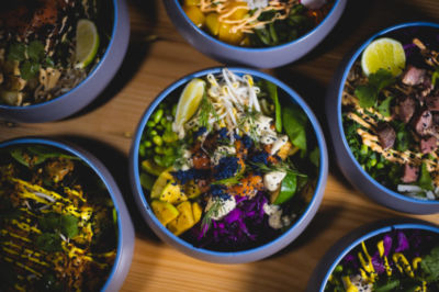 jasmine rice, sriracha mayo, cabbage, lemon cucumber, apple, raisins, edamame, beansprouts, carrot, spinach, coriander, coconut, sesame, lime